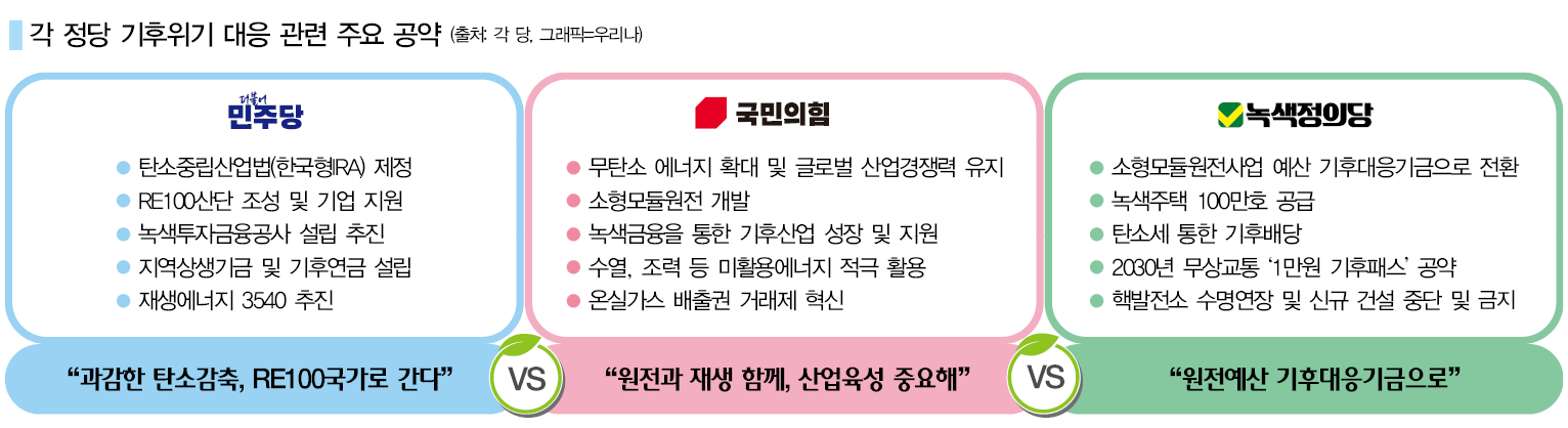 국민의힘은 2월 27일과 29일 두 차례에 걸쳐 기후위기 공약(16호, 18호)을 발표했다. 국민의힘은 원전과 재생에너지를 함께 가져간다는 기조 아래 산업경쟁력을 강화하는 데 초점을 맞춘 모양새다. 여당은 16호 공약에서 가장 먼저 2024년 2조4000억 규모의 기후대응기금을 2027년까지 5조로 확대하며, 소형모듈원전개발을 비롯해 기후위기 특별위원회 상설화를 목표했다. 또한 무탄소 에너지 확대 및 투자와 연구와 수소생태계를 구축하면서도 차세대원전 기술 개발 추진 등 원전과 재생에너지를 균형적으로 확충해 나간다고 밝혔다. 이밖에도 기업의 탄소배출권 유상 할당을 늘리되 기업의 탄소감축 설비를 지원하는 내용 등을 담았다.