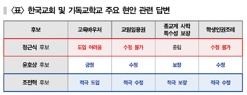 이번 결과에 대해 총평 및 제언한 사학미션 박상진 상임이사는 “한국교회의 정책 질문에 대해 성의 있게 응답한 후보 모두가 교육의 선택권과 자주성을 보장해주길 기대한다”라며 특별히 (종교계) 사립학교의 진흥을 위한 적극적인 정책을 마련해주길 촉구했다.