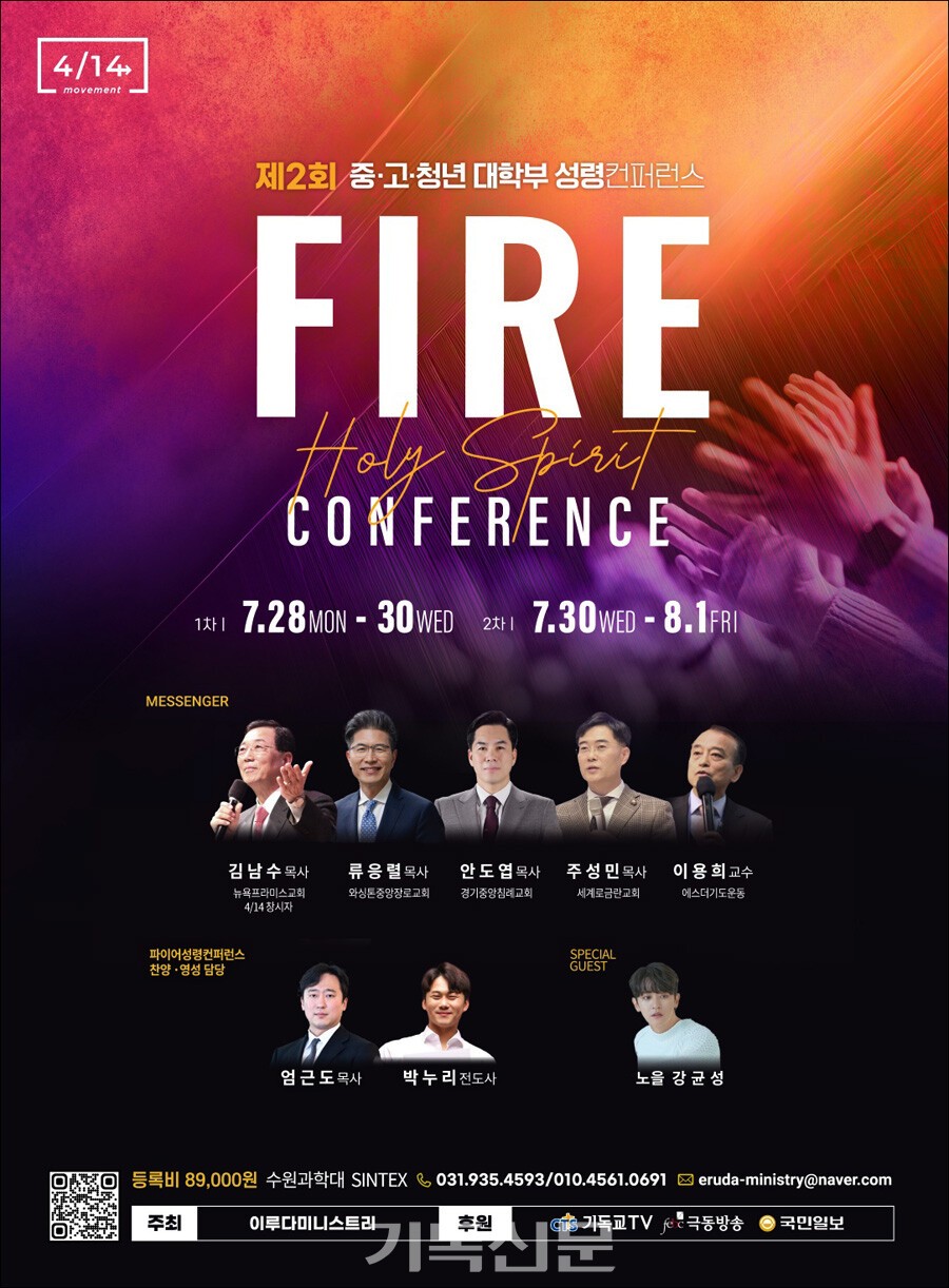 대한민국 다음세대가 한국 사회를 리드하고, 세계 선교의 사명을 감당한다. 이루다미니스트리(대표:주성민 목사)가 주최하는 ‘FIRE 성령 컨퍼런스’가 수원과학대학교 SINTEX에서 7월 28~30일, 8월 1~3일 두 차례 진행한다. 한국 교회 다음세대 4000명이 참석하는 FIRE 성령 컨퍼런스는 살아계신 하나님을 만나 미래의 사명을 다짐하는 자리로 채워질 예정이다.