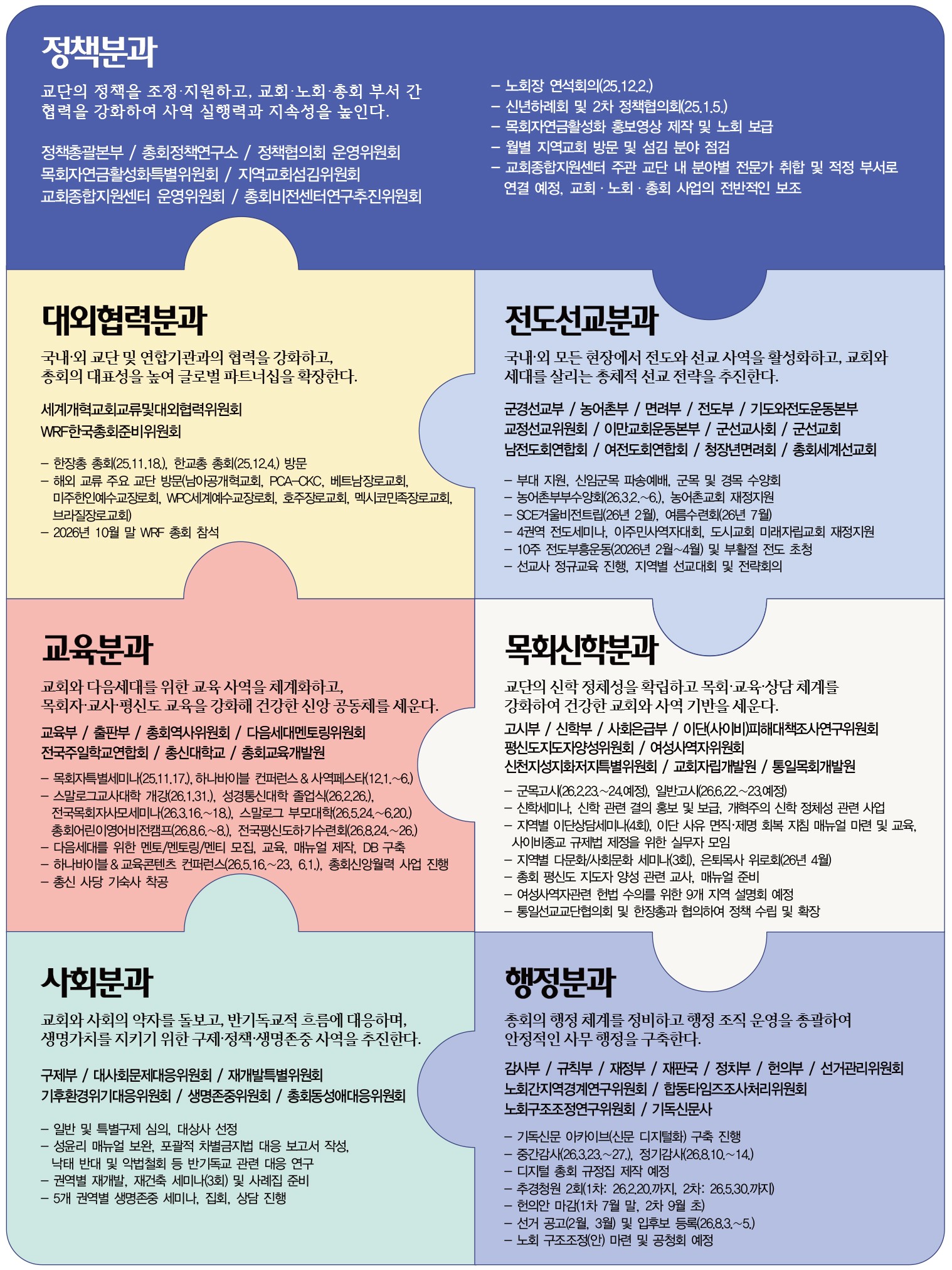 이어 각 부서의 임원들은 사역분야에 따라 전도선교, 교육, 목회신학, 사회, 정책, 행정, 대외협력 등 7개 분과로 나뉘어 회의를 가졌다. 전도선교분과의 경우, 전도부 면려부 군경선교부 농어촌부 등 상비부와 기관인 총회세계선교회(GMS) 전국남전련 전국여전련 전국CE SCE, 이만교회운동본부 기도와전도운동본부, 군선교회 군선교사회 군경선교회까지 14개 부서와 기관이 모였다.